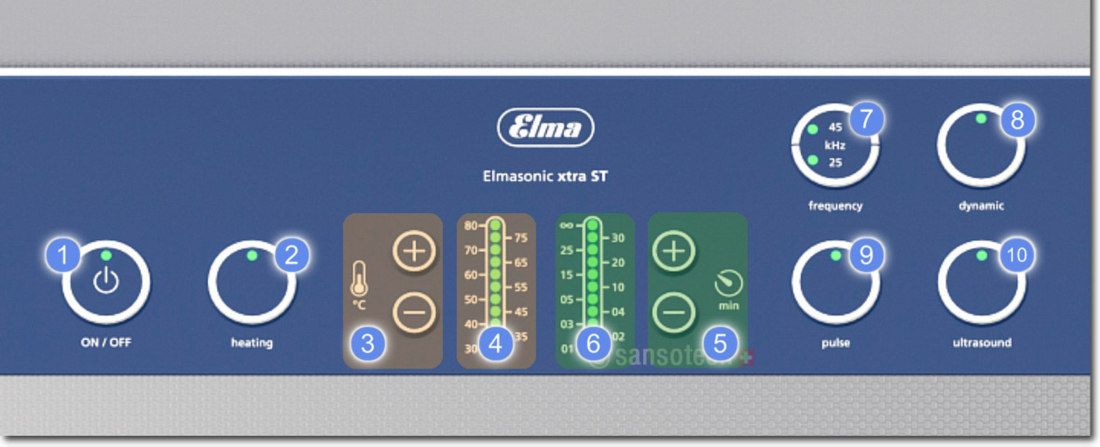 8 Taste dynamic: zur effektiven Reinigung durch gleichmässige Leistungsverteilung und Leistungserhöhung. Bei Aktivierung leuchtet die grüne LED im Tastenfeld. Die Funktion dynamic kann vor und während des Ultraschallbetriebs beliebig ein- oder ausgeschaltet werden. | ||||