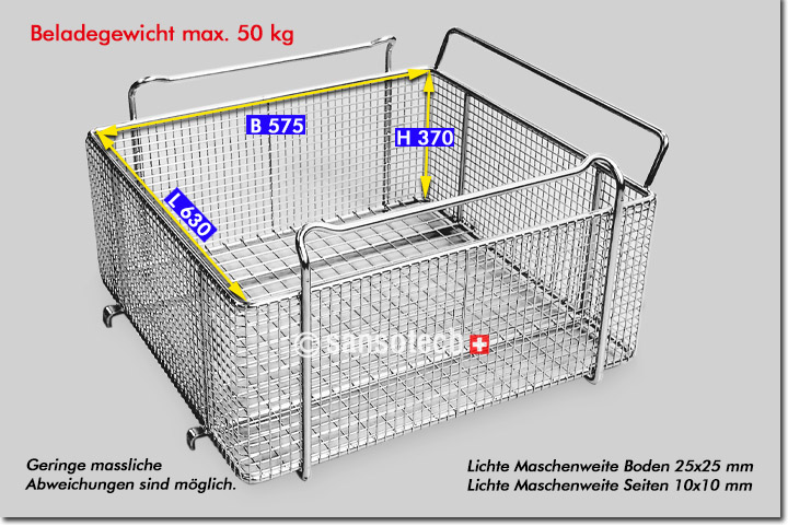 Innenmasse Wanne Breite (1) x Tiefe (1) x Höhe (1/2) ca. | 700 x 610 x 465/485 mm, mit Schrägboden zum besseren Entleeren |